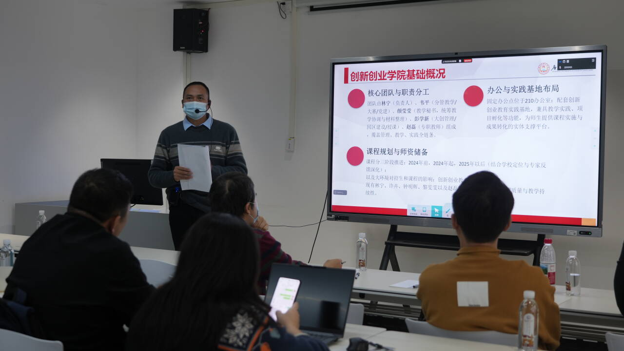 林宁副院长从学校双创教育体系、五位一体的双创实践体系、配套政策与经费支持、场地支持、等方面向任课教师们简要介绍了创新创业学院的基本情况和能为老师们今后在教学、带大创项目和打比赛提供的服务,希望任课教师们以搞好课程教学,提升创新创业教育教学能力为基础,与带项目和带赛形成联动,共同提升学生创新创业实践能力。