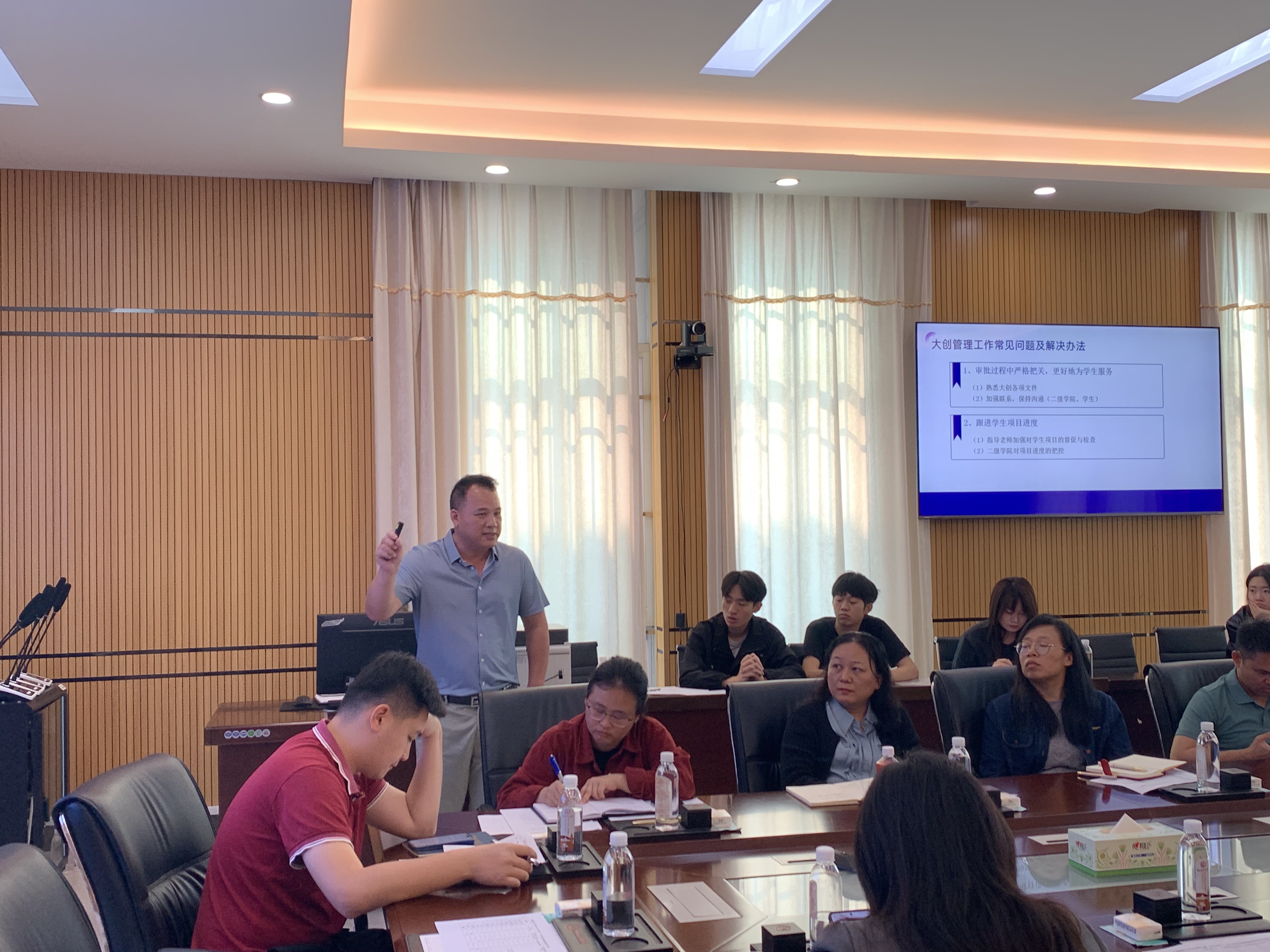 会议第三部分是彭学新老师对大创项目管理工作进行工作安排,他首先针对大创项目管理中钉钉审批、经费使用、结题管理、材料提交等工作环节中的常见问题进行了通报,对关键事项的规范操作进行详细说明,明确经费支出比例、报销规范、延期规则,确保项目管理规范有序、经费使用安全高效。